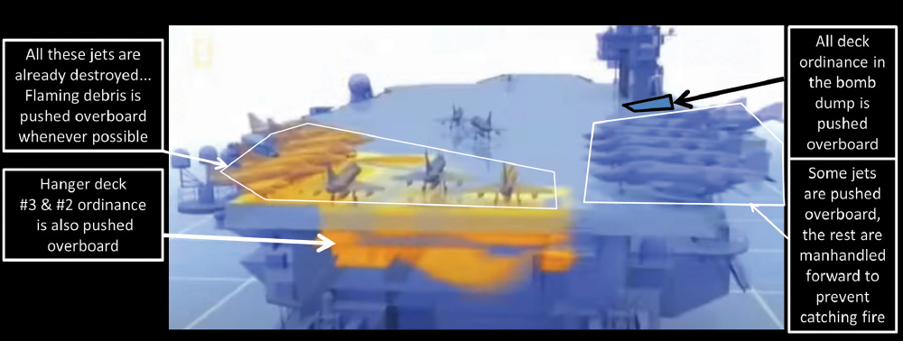 By 10:57 am, the overall situation was grave indeed. Thousands of gallons of JP-5 were pouring below decks in multiple flight deck holes (see Figure 7).