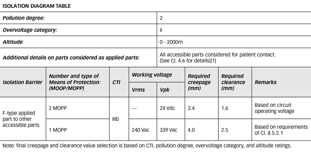 As shown in Table 1, for a secondary circuit operating at 24 Vdc, when F-type applied part requirements are introduced, the worst-case spacing is based on the maximum mains operating voltage. It is important to consider both requirements and ensure that the worst-case construction (the largest spacings requirements) is met.