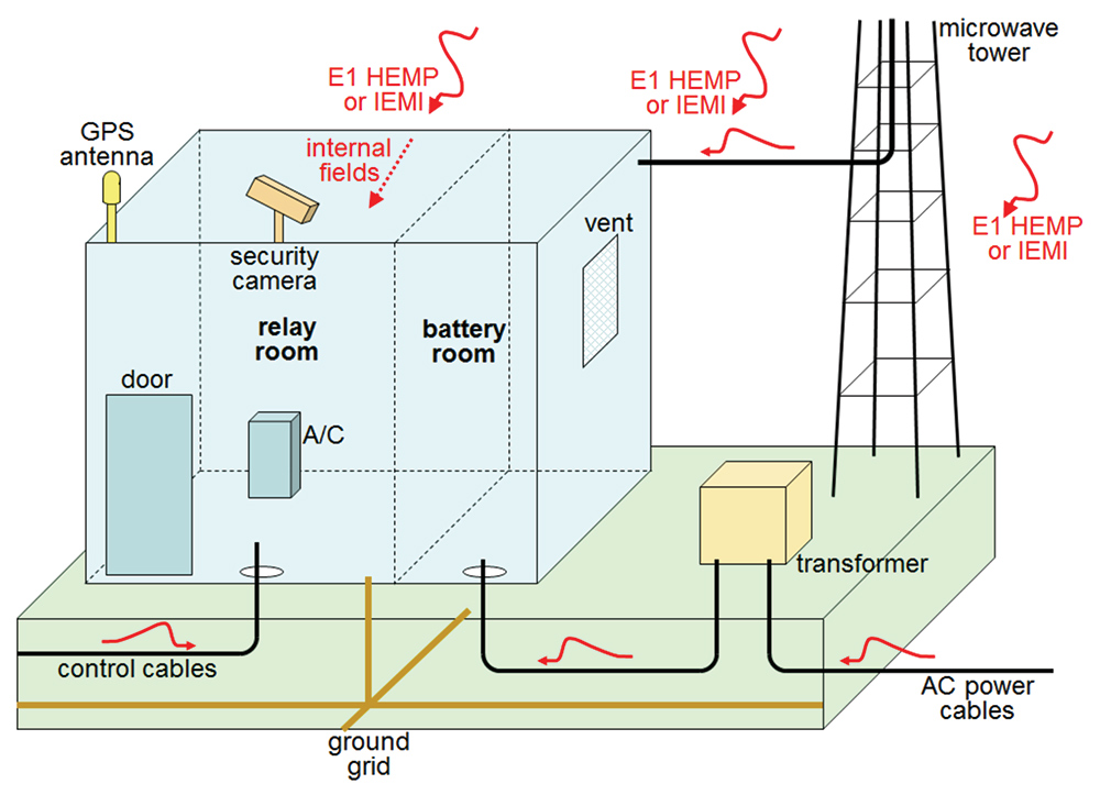 The best solution is to improve the hardness of the existing buildings by upgrading the protection of the best existing buildings, and to use this design for new substation control buildings, if needed. In addition, due to the criticality of particular substations (depending on their location and their service area), some of the existing buildings can be upgraded over time. For substation control houses, what should be the approach to evaluate methods to upgrade the hardening to HEMP and IEMI? Let us examine Figure 3, which describes the basic substation control house and the ways that EM fields and conducted transients can penetrate the building.