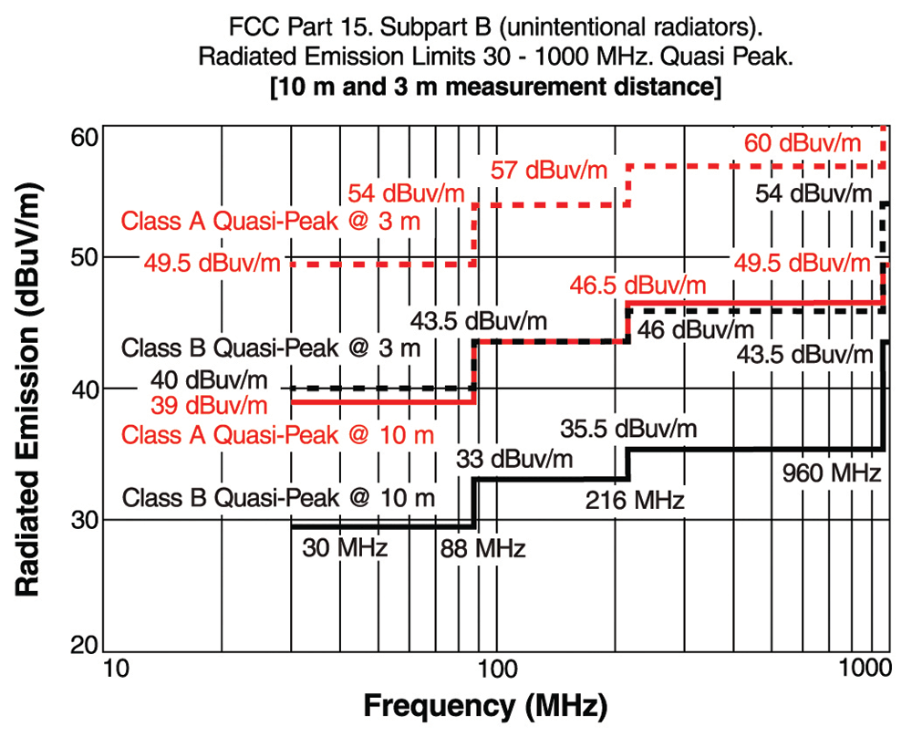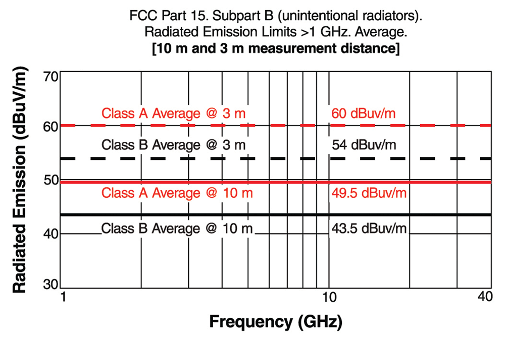 Figure 2 shows the test limits for FCC Part 15 (radio frequency devices) Subpart B radiated emissions limits for frequencies greater than 1 GHz for average measured values at 3 m and 10 m distances. Figure 3 shows the same for measured quasi-peak values.