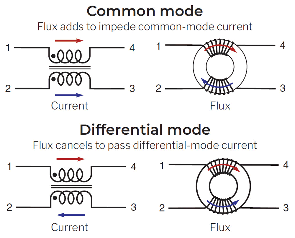CM currents travel in the same direction through one or more conductors toward a common return point that closes the current loop (e.g., ground). When the return path is not intentional, the CM current may be the result of energy capacitively or magnetically coupled to the common point. Common mode chokes are designed to create high impedance to such CM noise (Figure 1) while presenting low impedance to the desired differential signal.