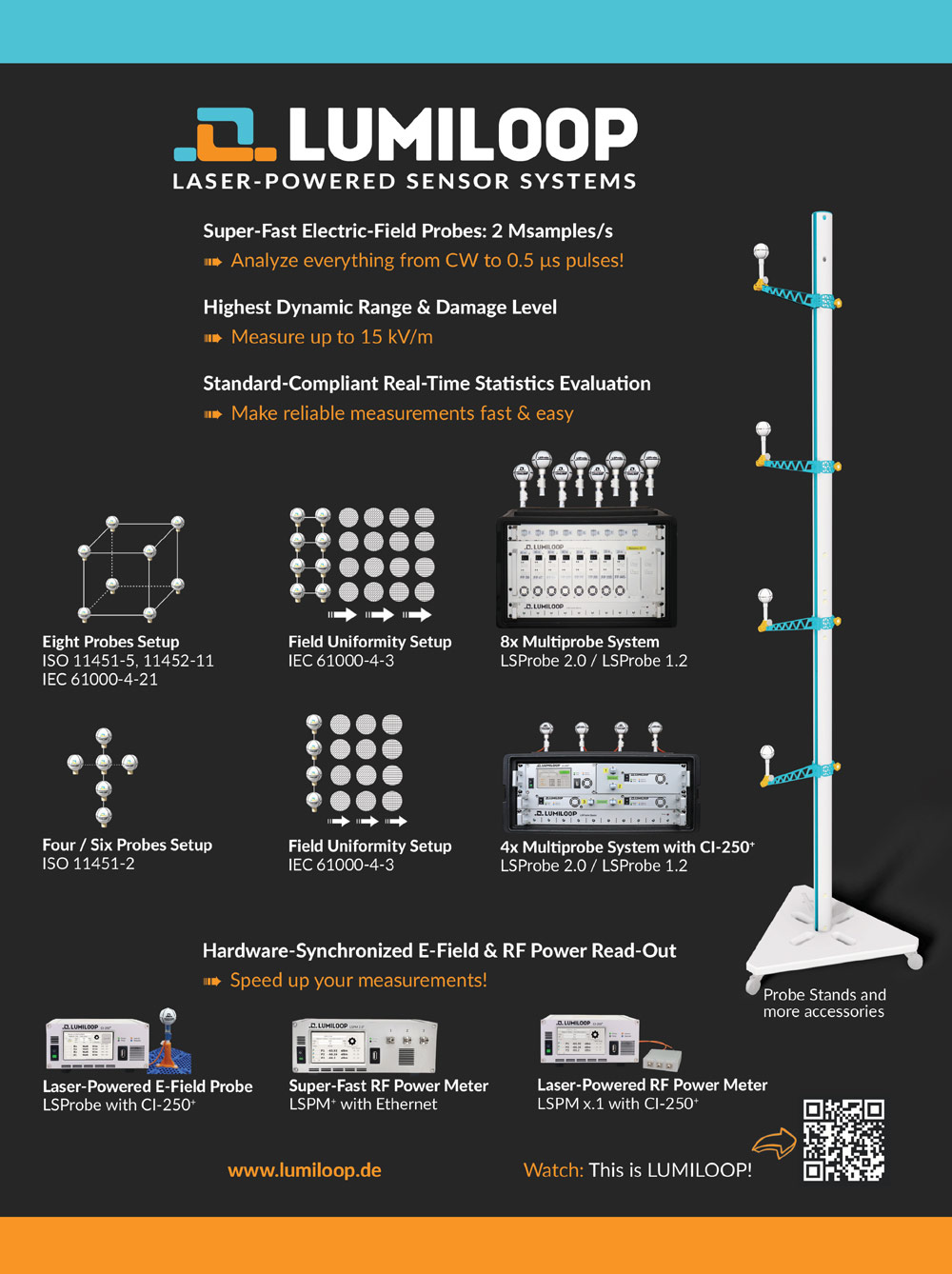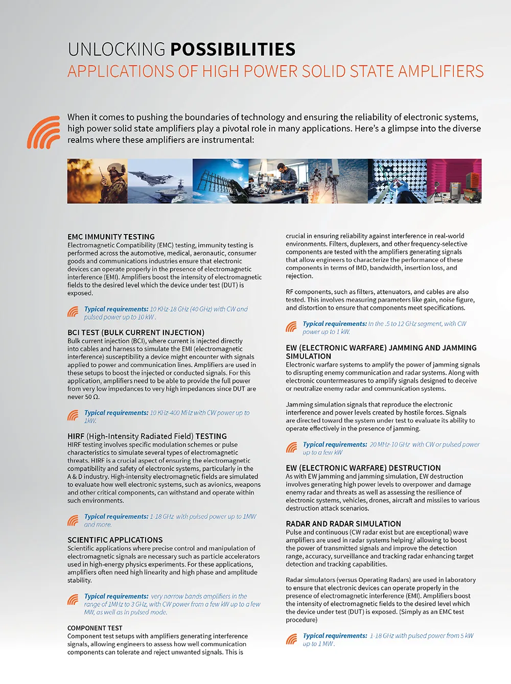 AR specializes in the manufacture and distribution of RF and Microwave CW and Pulsed solid-state amplifiers, covering frequencies from 10kHz to 18GHz and power levels up to hundreds of kW. Our comprehensive EMC radiated immunity solutions include RF immunity test systems (featuring multitone systems), EMC test software, and a wide range of accessories such as antennas, cables, field probes, positioning equipment, and control switches. Recognized globally, Amplifier Research is synonymous with outstanding quality and exceptional value.