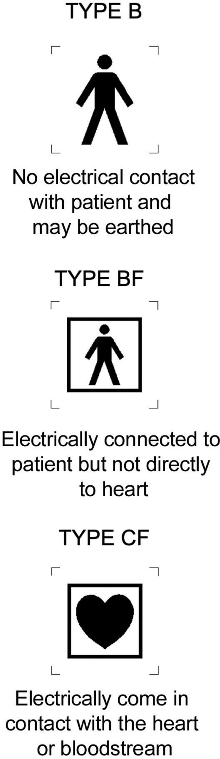 • Type BF and CF applied parts: These applied parts provide a higher level of isolation compared to Type B applied parts. Type BF (body floating) applied parts are designed for use in direct contact with the patient’s body, offering a higher degree of protection against patient leakage current. Type CF (cardiac floating) applied parts provide an even greater level of isolation, specifically for devices used in close proximity to the heart or other critical areas.