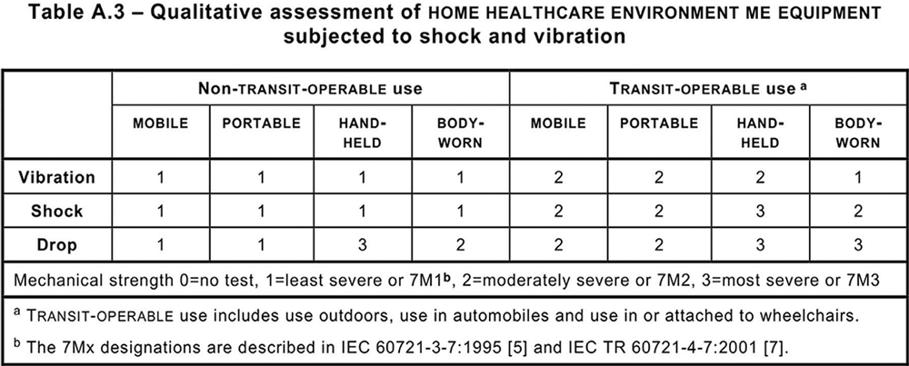 Qualitative assessment of home healthcare environment ME equipment subject to shock and vibration (Table A.3 from IEC 60601-1-11 [5])