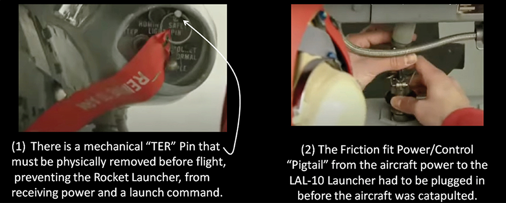 In addition, the right pigtail friction fit power and firing line connector had to be attached. This pigtail connected the aircraft power and all firing path connections between the F4-B and the LAL-10 launcher. If someone forgot to plug this pigtail in before flight, none of the weapon systems controlled by the LAL-10 would be functional. This connection was also supposed to be done at the catapult, hence the friction-fit nature of the quick disconnect connector. With these six interlock systems in place, the USN Systems Command’s official engineering position was that “it (would be) impossible to accidentally fire a weapon controlled by the LAL-10 on the deck.”