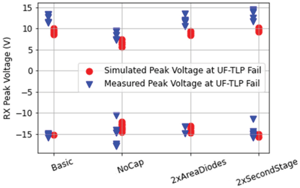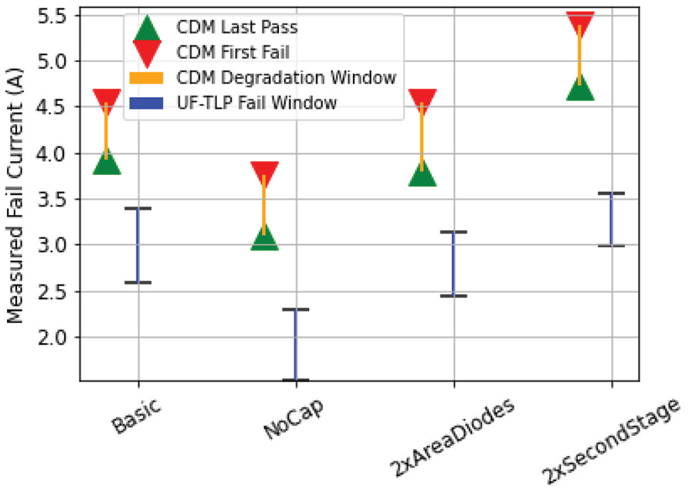 During a CDM event the sensitive gate oxide connected to the pad in an LNA circuit is damaged by the fast rise time component of 20ps or less as shown in [2]. VF-TLP with 1ns pulse width and 100ps rise time shows no correlation with CDM test (shown in Figure 2) and thus, cannot be used for predicting CDM robustness. Contrary to the expectation raised from the overestimation of the single LNA in [2], the CDM robustness can also be underestimated or show a “lucky” fit with the VF‑TLP results, depending on the circuit.